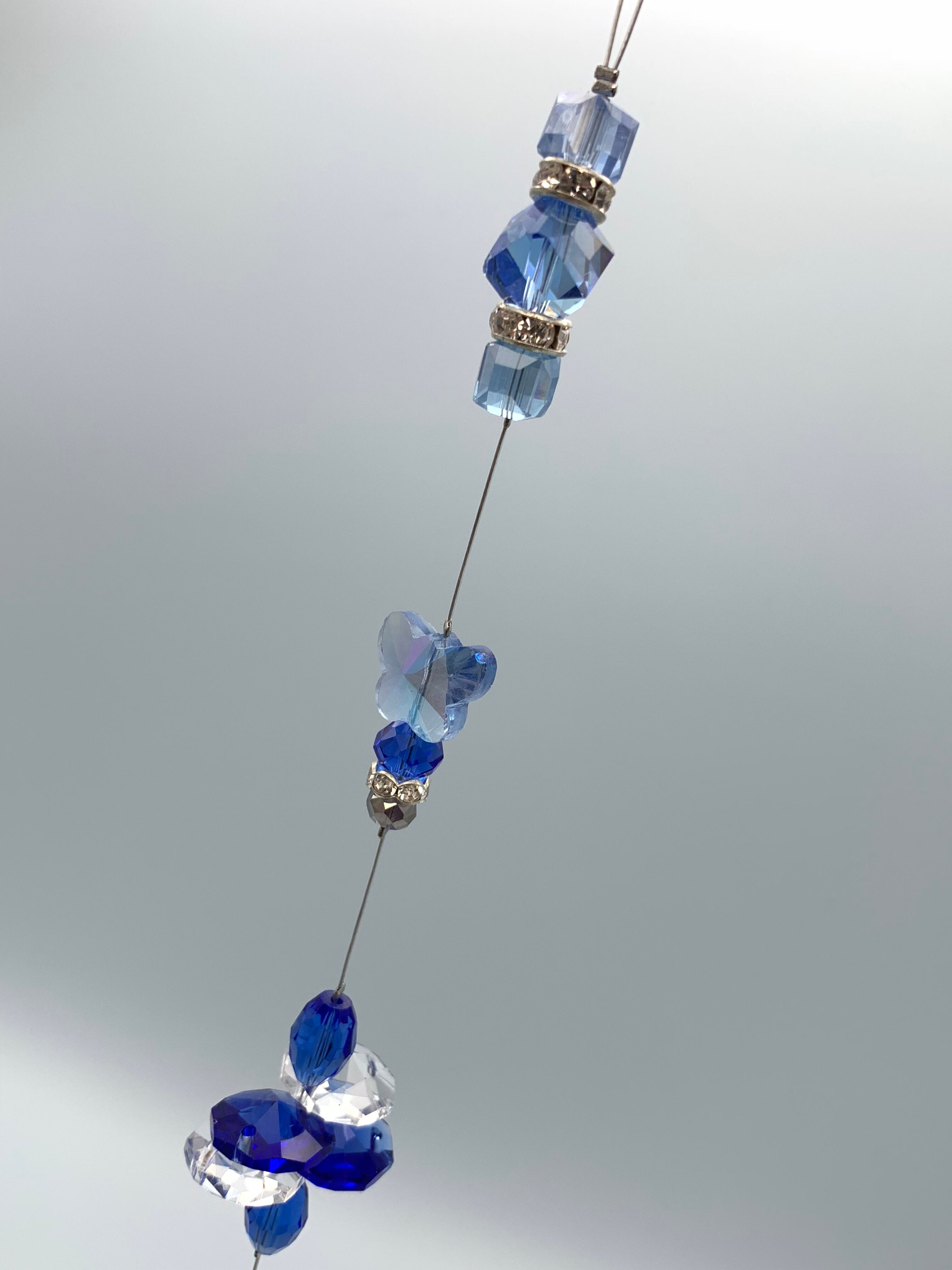 サンキャッチャー吊るしタイプのブルー4cm玉使用です♪ 濃いめのブルーで4cm玉の為、インパクトありますね♪ 10mmカット水晶を使用しております。