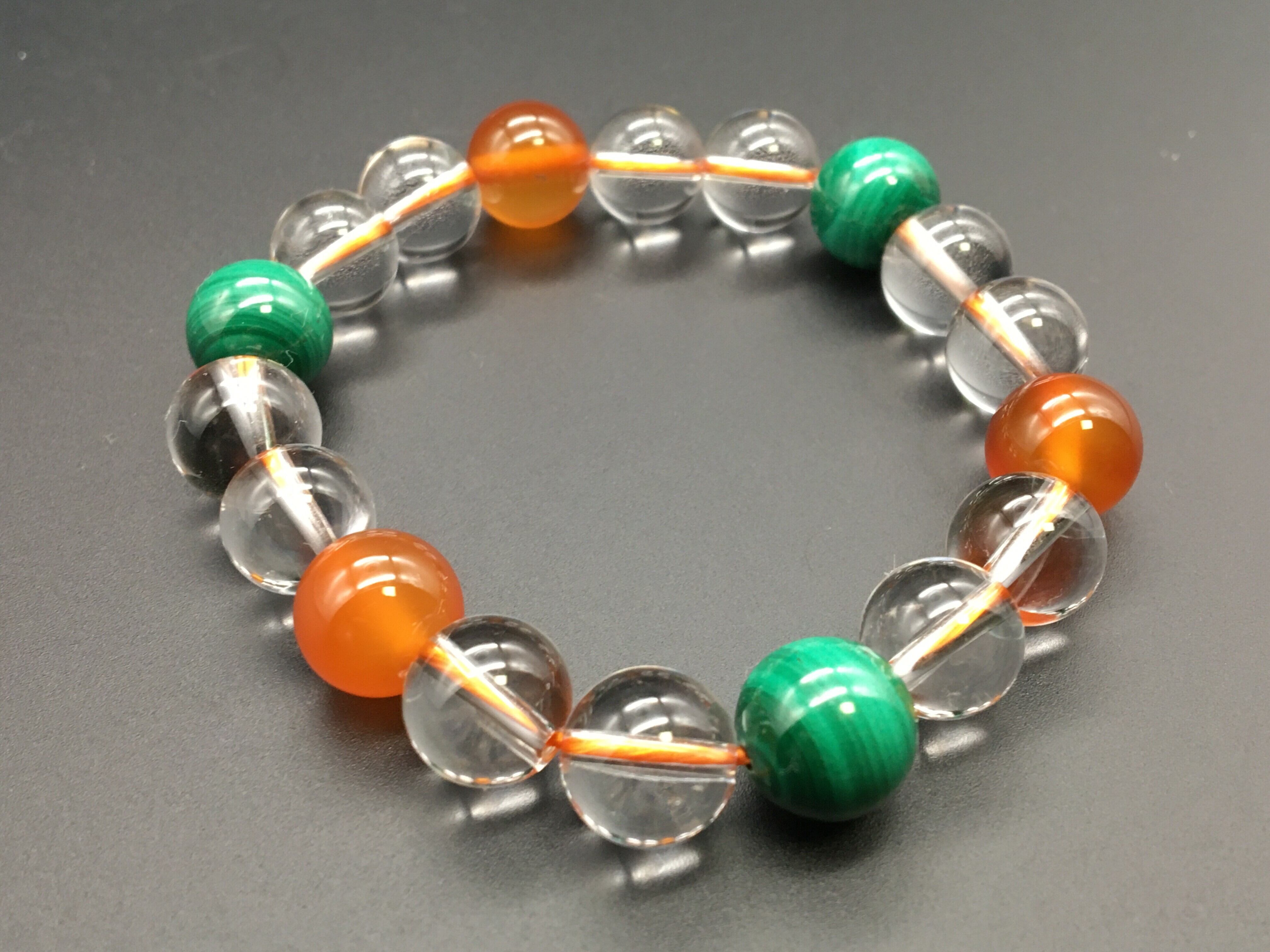 マラカイト(10mm×3粒)、カーネリアン(10mm×3粒)、水晶(10mm×12粒)