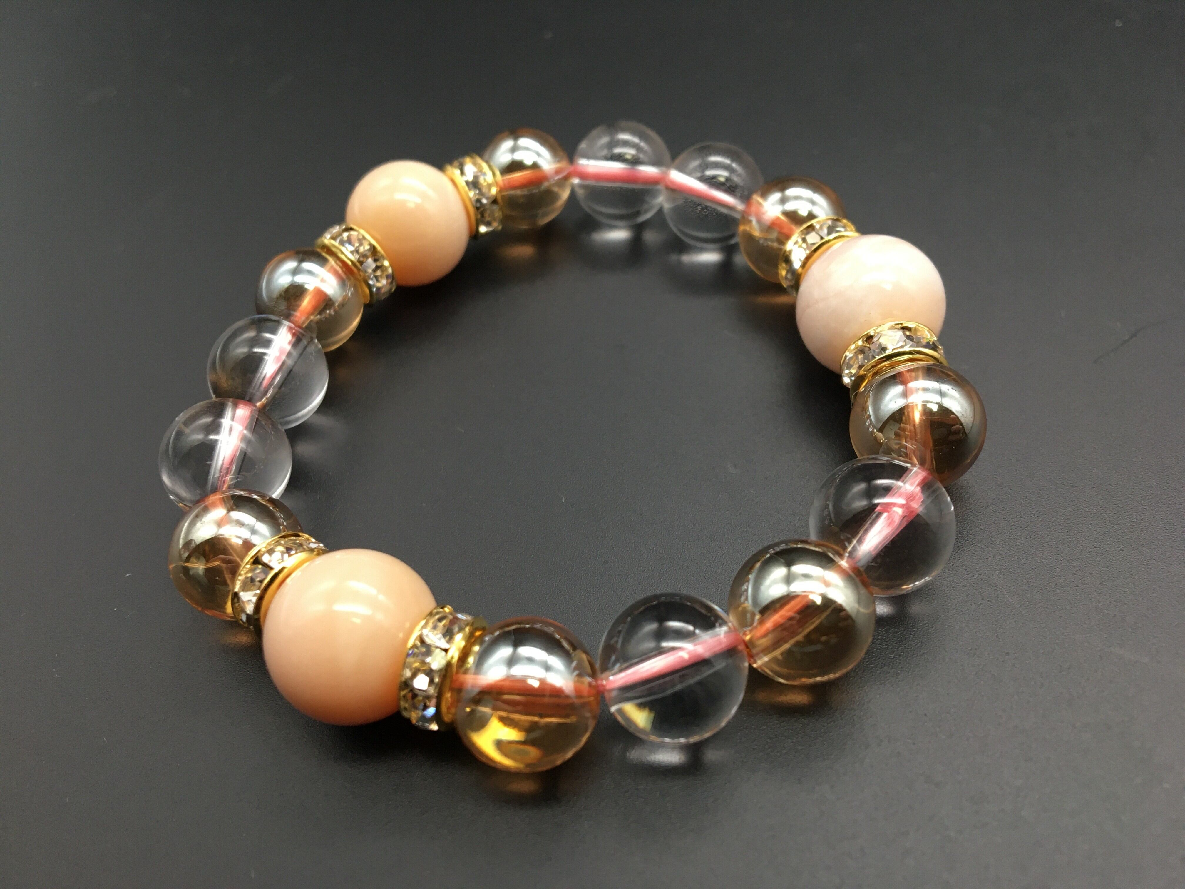 ピンクオパール(12mm×3粒)、シャンパンオーラ(10mm×7粒)、水晶(10mm×6粒)