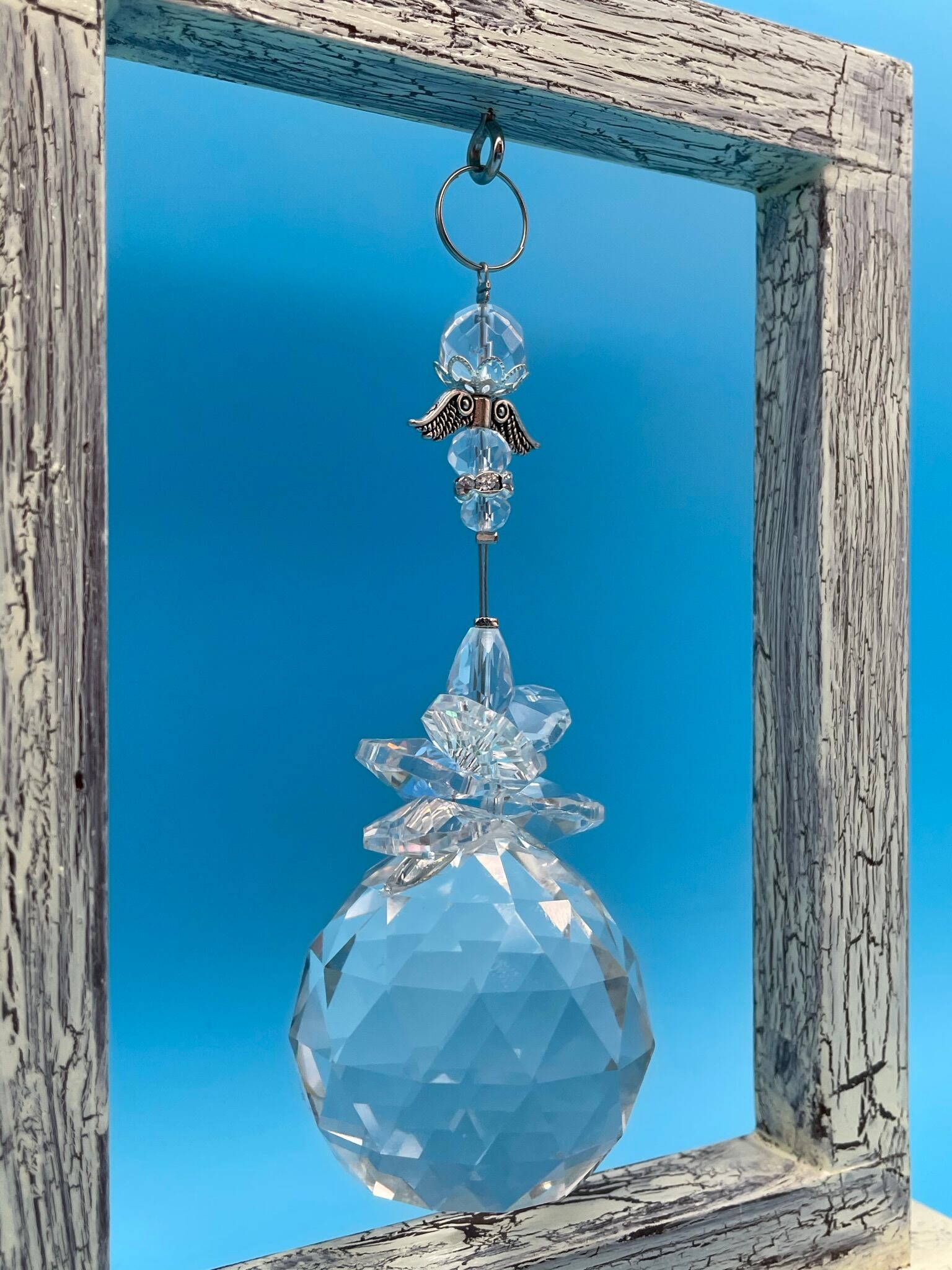 サンキャッチャー置物タイプのクリア4cm玉です。(木材:檜)